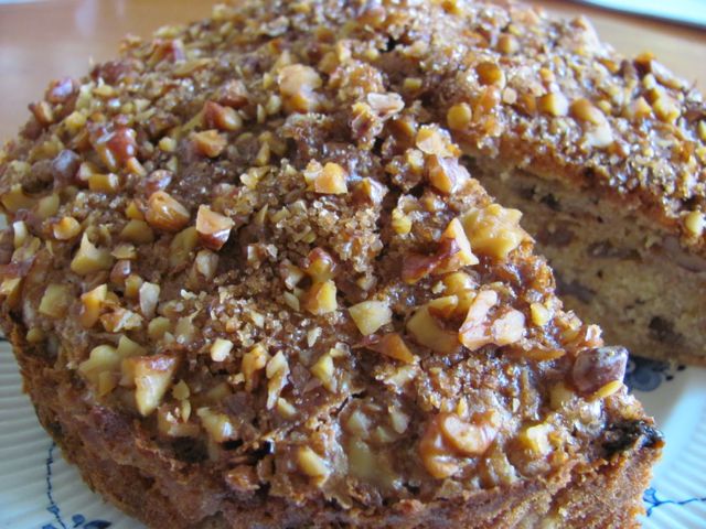 Put the rest of the walnuts on a chopping board and chop them even more finely using a large knife. Mix them with the Demerara sugar and sprinkle this crunchy topping evenly over the surface of the cake. Bake it in the oven for 90 minutes, then test to see whether it is cooked – a skewer or, if you’re me, a fine knitting needle, should come out clean – and you may find you need to leave it in the oven for another 10 minutes or so. When it’s done, take it out of the oven, put it on a wire rack and allow it to cool in the tin for at least 15 minutes before very carefully removing the tin – don’t turn the cake upside down to do this as some of the topping will fall off. Allow it to cool completely before serving.